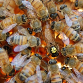 Illustration : Reine marquée entourée d’ouvrières. Les reines, en bonne santé, émettent des phéromones très attractives pour les ouvrières. © Freddie-Jeanne Richard